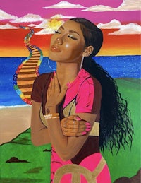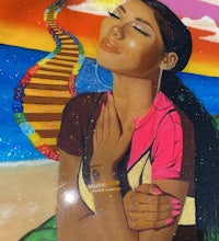 Jhené Aiko is a representation of tranquility and being at peace. I wanted to express that in this painting by adding, warm and bright colors with a stairway to Heaven on a glittery beach.