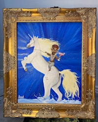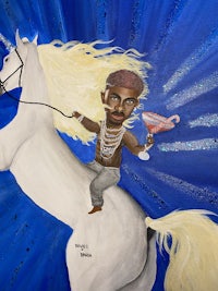 My vision for this painting was to think outside the box and create some thing I haven’t seen before. It resulted in Lil Nas X riding a icy unicorn as a little person in the winter! .